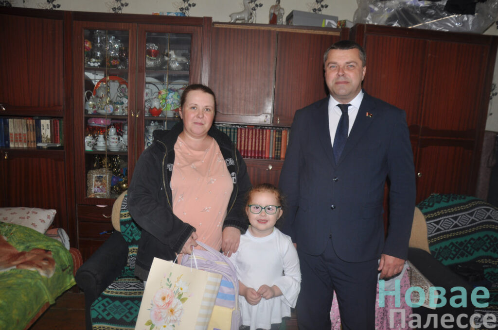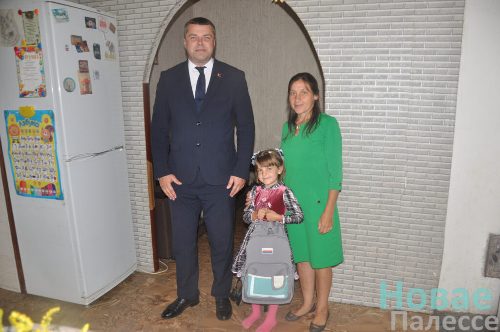 Глава района Николай Пьявко посетил семью Яны Антонович из Житковичей и подарил будущей первокласснице школьный рюкзак с канцелярскими принадлежностями.