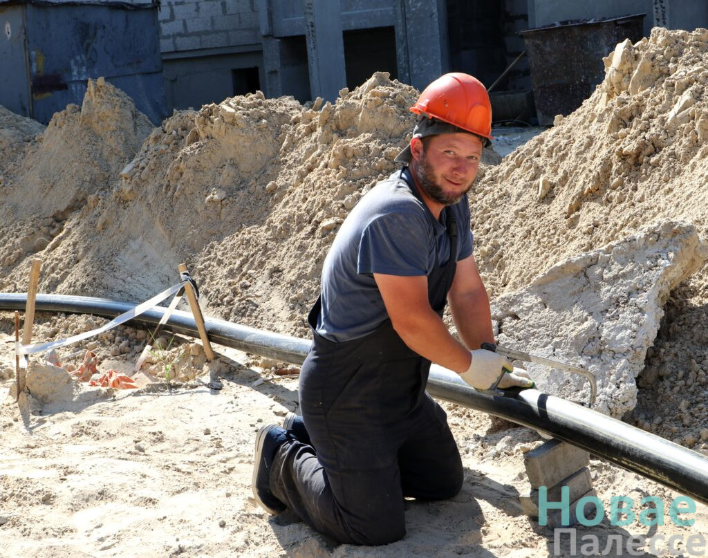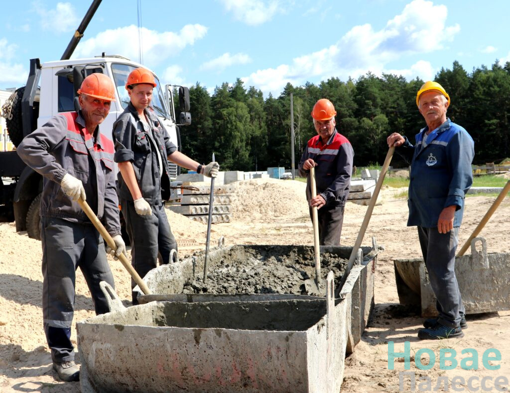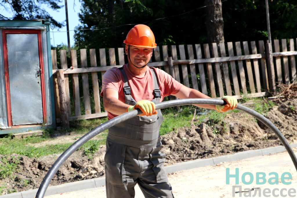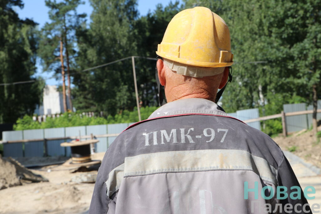 Вторая строительная площадка, на Приозёрной, нас встретила хаотичной активностью. Первым на пути нам попался прораб Дмитрий Давидович из Мозырского монтажного управления №45 с бригадой электромонтёров. Пока суть строительного дела, они оперативно ведут «кабель 0,4 киловольта от АТП-615 до дома». И обеспечивают наружное освещение. Всё в совокупности, конечно же, облегчит рабочие процессы на площадке.