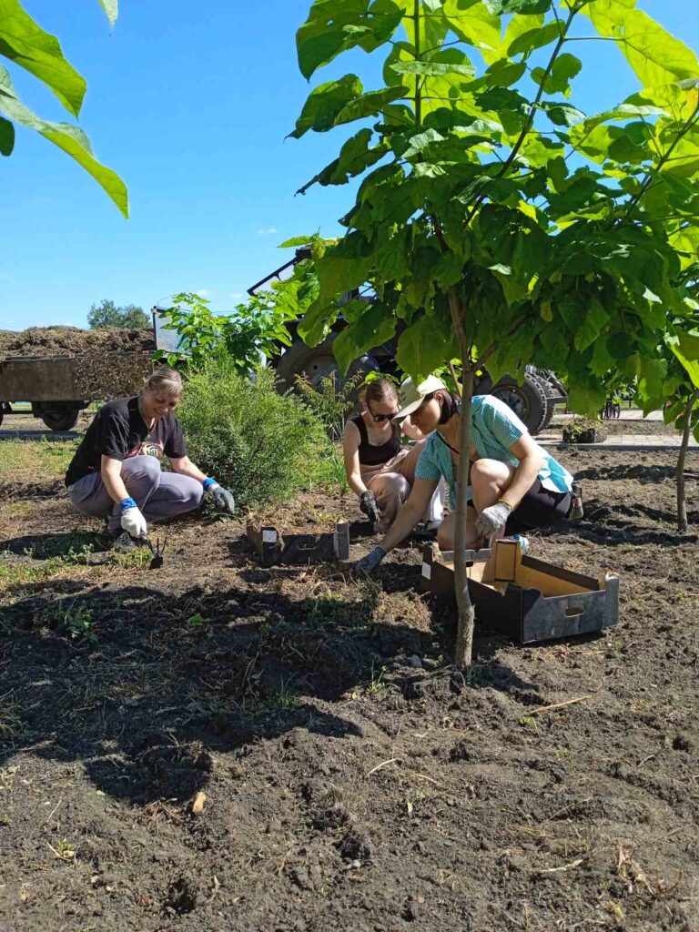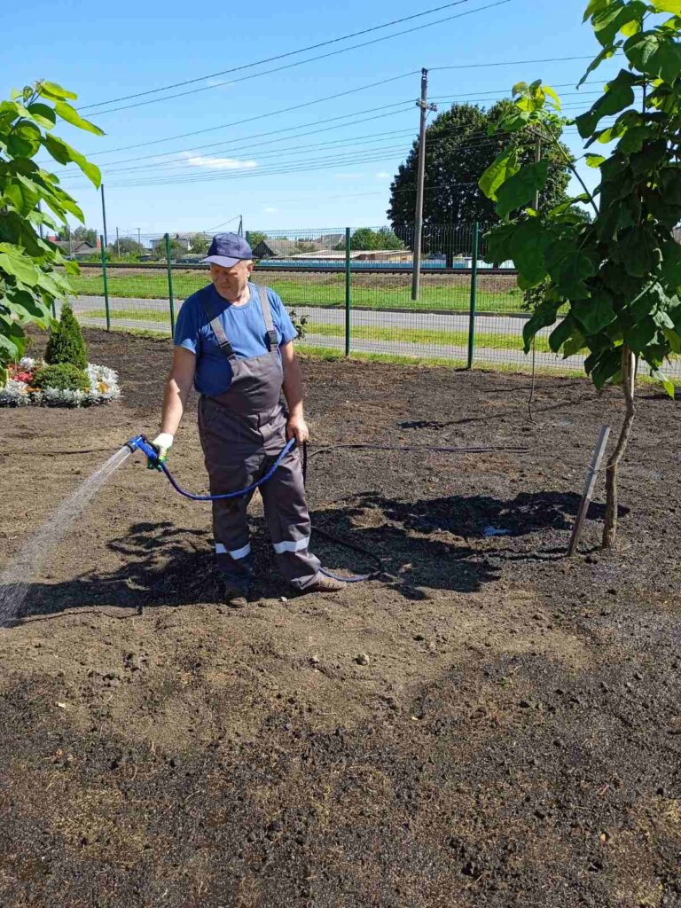 В рамках областного субботника они подготовили почву и высеяли газонную траву.