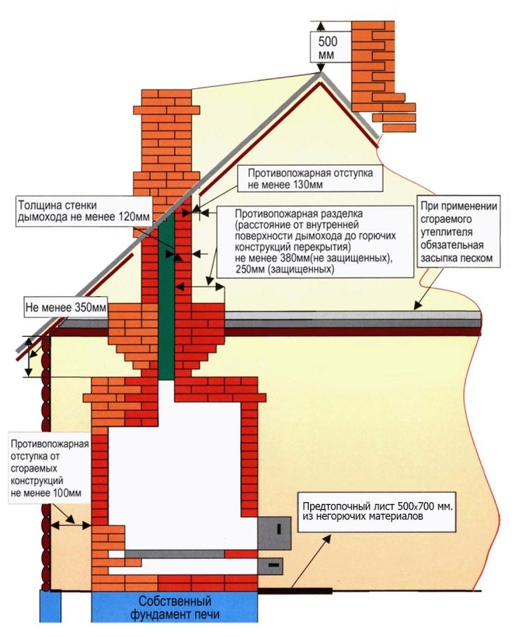 Огнеборцы информируют население о необходимости формирования разделки (распушки). Говоря простым языком, это расширение дымохода отопительной печи в потолке. Задача своеобразной перевёрнутой пирамиды – отводить тепло. Расстояние от внутренней стороны до горючих материалов должно достигать 380 мм, либо 250 мм, если горючие материалы защищены негорючими, например, асбестом.