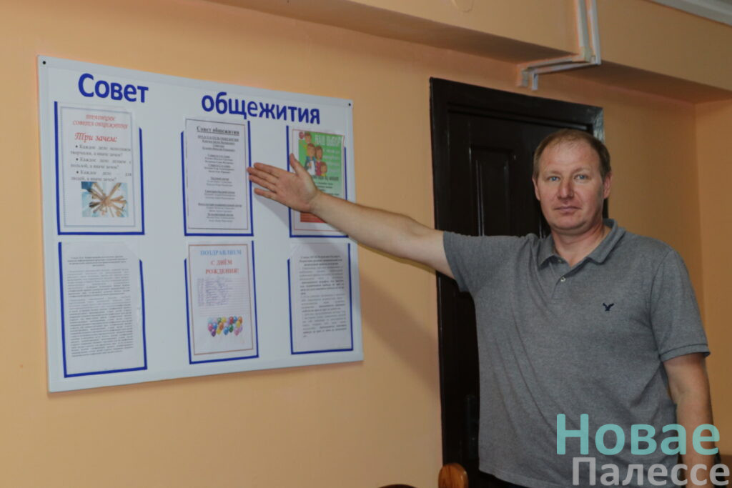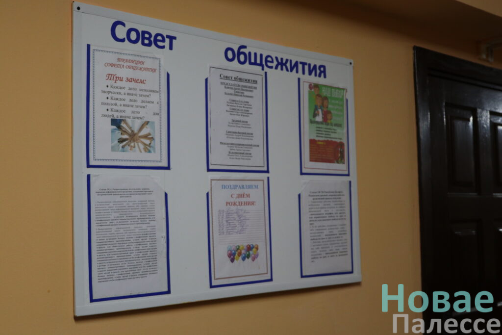 Заведующий общежитием Олег Акаев подсчитал, что первокурсники составляют около трети жильцов. Чтобы заселить всех нуждающихся, пришлось слегка потесниться. В апартаментах – по четыре человека, есть необходимая мебель – кровати, тумбочки, стол и шкаф. Предусмотрены и бытовые удобства – санитарная и комната со стиральными машинами, ванной и гладильной доской. В этом году колледж приобрёл новый холодильник, заменили 30 матрацев, один стенд подарила районная профсоюзная организация АПК, другой – купили за внебюджет.