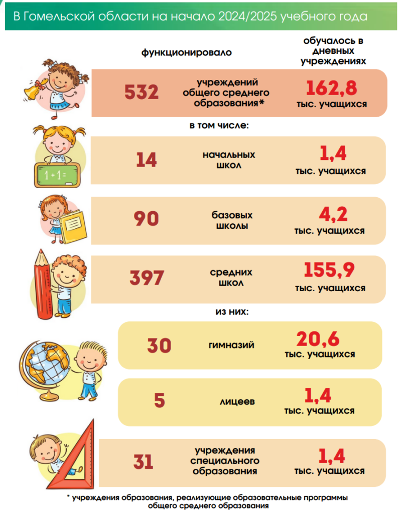 В 2024/2025 учебном году в регионе приступили к занятиям 162,8 тысячи учащихся в 532 учреждениях общего среднего образования, сообщает Главное статистическое управление Гомельской области.
