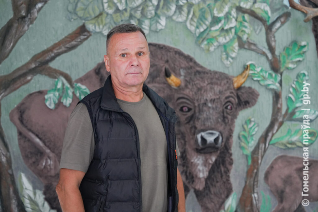 В родном колледже практически каждый уголок благоустроен рукастым преподавателем: на входе гостей встречает панно с зубрами и национальной символикой, в фойе на втором и третьем этажах созданы тематические зоны о родной природе, памятных событиях Великой Отечественной войны, пользе спорта и вредных привычках. Все это не только из дерева, иногда мастер просто расписывает стены красками. И это выходит художественно. В столовой он создал большую картину в деревянном обрамлении. И даже баскетбольная площадка на улице – его рук дело: