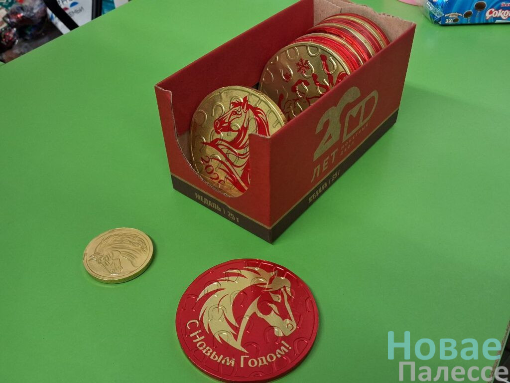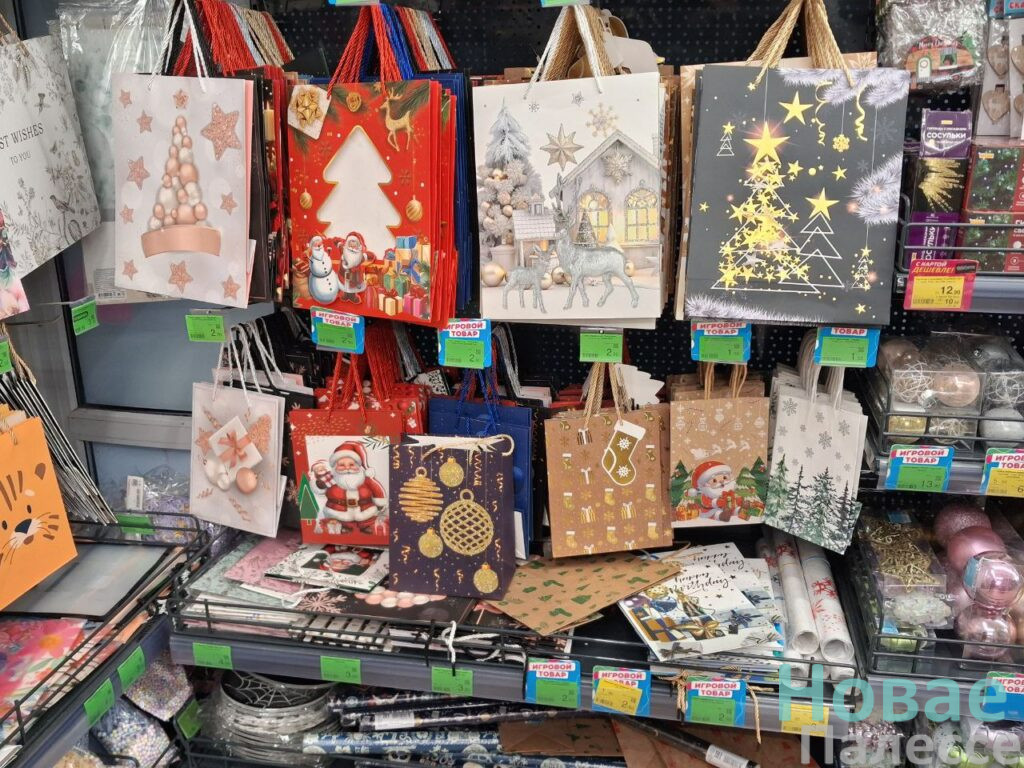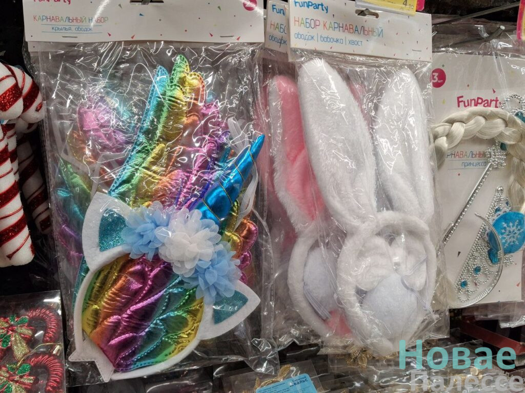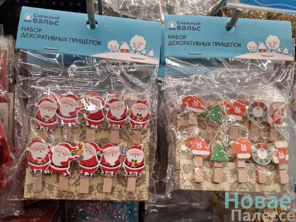 Зато в магазине «Три цены» насчитали столько же коней — и все шоколадные. Два в виде медалек по 2,25 (25 г) и 0,99 руб. (6 г) и 55-гаммовая шахматная фигурка за 3,59 руб. Пушистую ёлочку высотой 60 см. здесь можно купить за 13,90 руб. Искусственная сосновая ветка для букета обойдётся в округлённых семь рублей, а рождественский веночек – в 7,90 руб. Всего два рубля стоит колпак Санта-Клауса. Ребятишек, несомненно, порадуют карнавальные наборы в ассортименте, а взрослые с чувством юмором оценят мешок забавных прищепок «Снежный вальс».