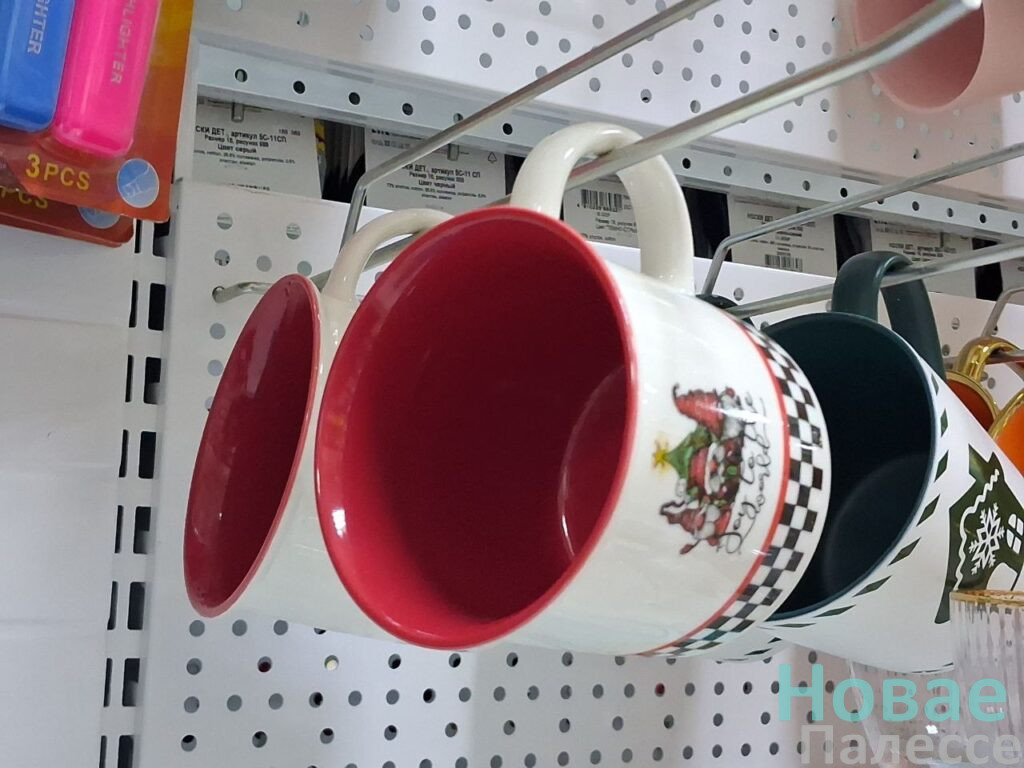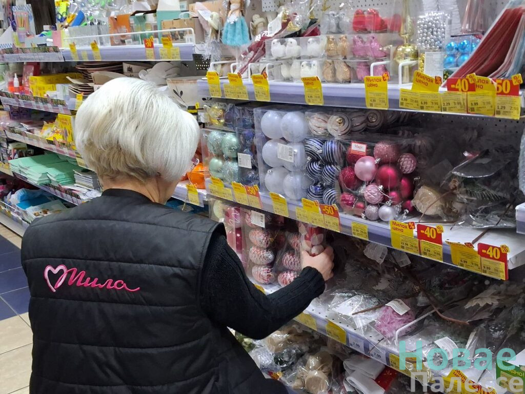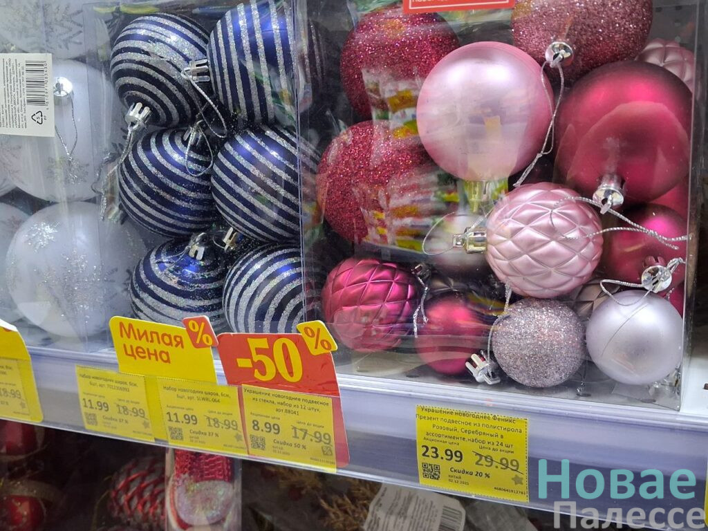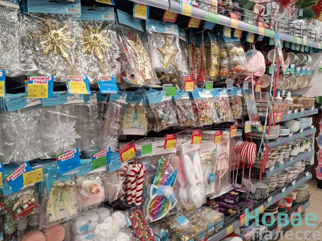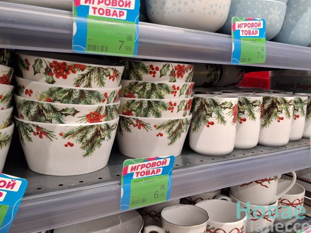 Первой точкой на маршруте стала «Мила». Здесь для новогодней атрибутики отвели несколько полок. Приглянулись симпатичные наборы ёлочных шаров с 50-процентной скидкой. В подарок можно взять и оригинальную посуду. Например, керамический салатник с Дедами Морозами подешевел до 3,99 рублей, а кружка с таким же декором стала стоить без копейки семь рублей. Внимание привлекли парящие на верёвочках фигурки ангелочков за 4,99 руб. А вот символ-2026 нашёлся в единственном экземпляре, но пластиковая подвесная лошадка-карусель, если честно, не впечатлила.