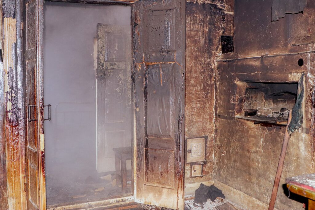Пожар уничтожил и повредил имущество в жилой комнате. Рассматриваемая версия причины пожара – неосторожное обращение с огнем при курении.