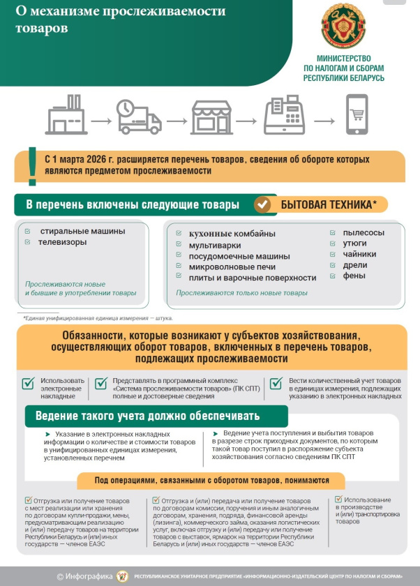 Инспекция МНС по Гомельской области напоминает юрлицам и ИП о расширении с 1 марта 2026 года перечня товаров, подлежащих прослеживаемости