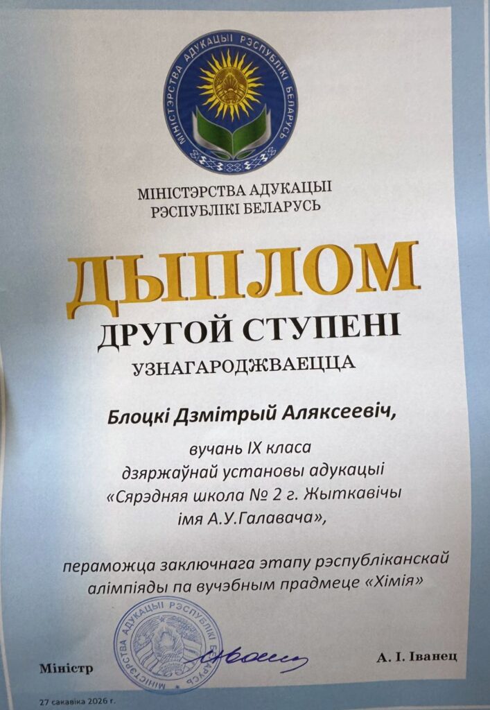 Награда такого же достоинства по химии у Дмитрия Блоцкого, ученика 9 класса СШ N2 г. Житковичи.
