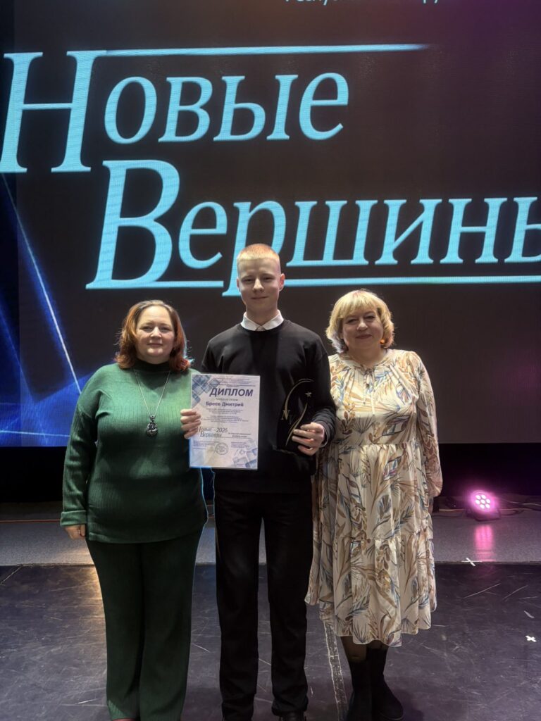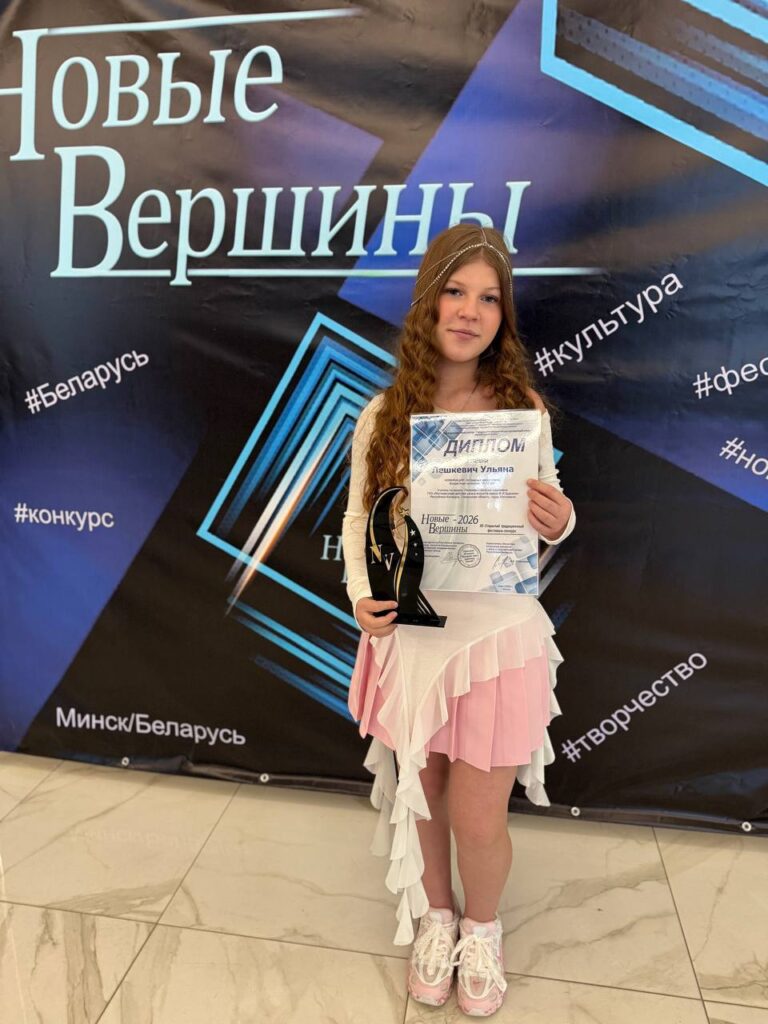 С XII Открытого традиционного фестиваля-конкурса «Новые вершины» диплом I степени в номинации «Сольное пение» привезла Ульяна Лешкевич (учитель Наталья Рогалевич). Лауреатом III степени в номинации «Струнные инструменты, домра» стал Дмитрий Бреев (учитель Татьяна Юденко, концертмейстер Мария Котенёва).
