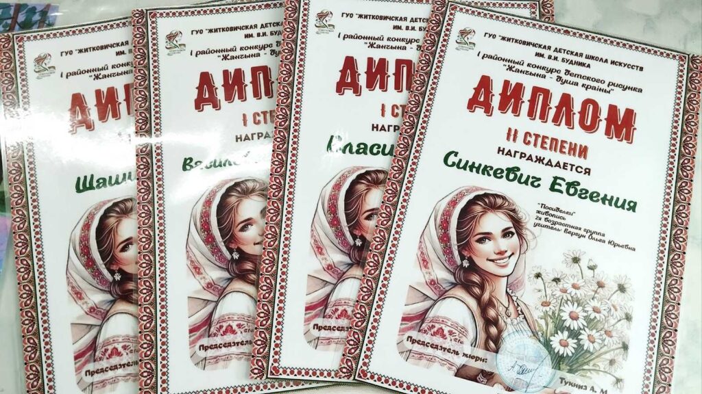Заслужили диплом III степени: Арина Баранова, Анастасия Лавникович, Дарина Трафимович (учитель Анна Тукина). Выставка работ юных художников, экспонируемая в холле, стала наглядным воплощением Года белорусской женщины.