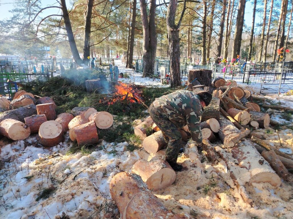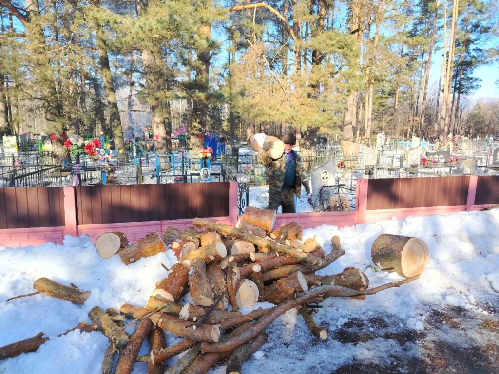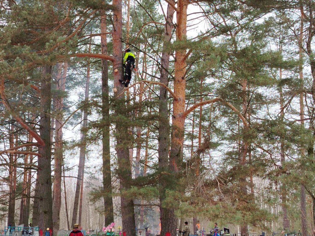 В деревне Бронислав в эти дни альпинисты сносят сосны, угрожающие обрушением и повреждением надмогильных плит и оград.