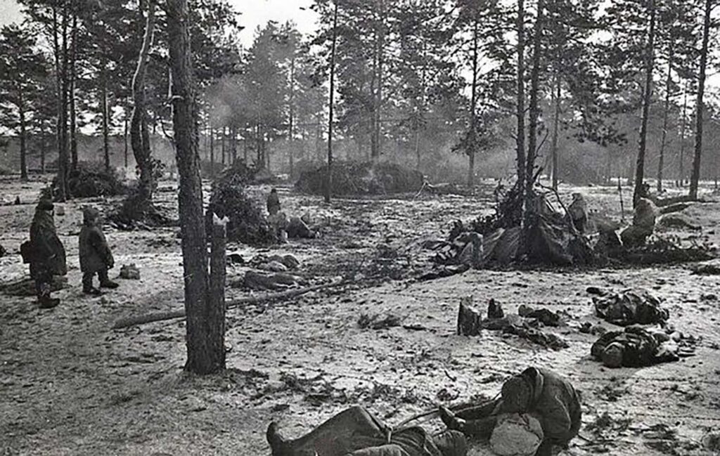 Вид нацистского лагеря смерти около деревни Озаричи (ныне городской посёлок в Калинковичском районе Гомельской области). Март 1944 г.