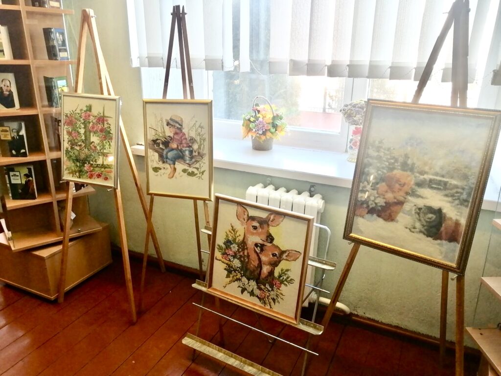 В центральной районной библиотеке отрылась выставка уникальных работ Нины Миранович из деревни Ветчин. На ее картинах, вышитых крестиком, живо и ярко раскрываются особенности полесской природы, гармоничность, будто собранных флористом, букетов, доверчивость животных.