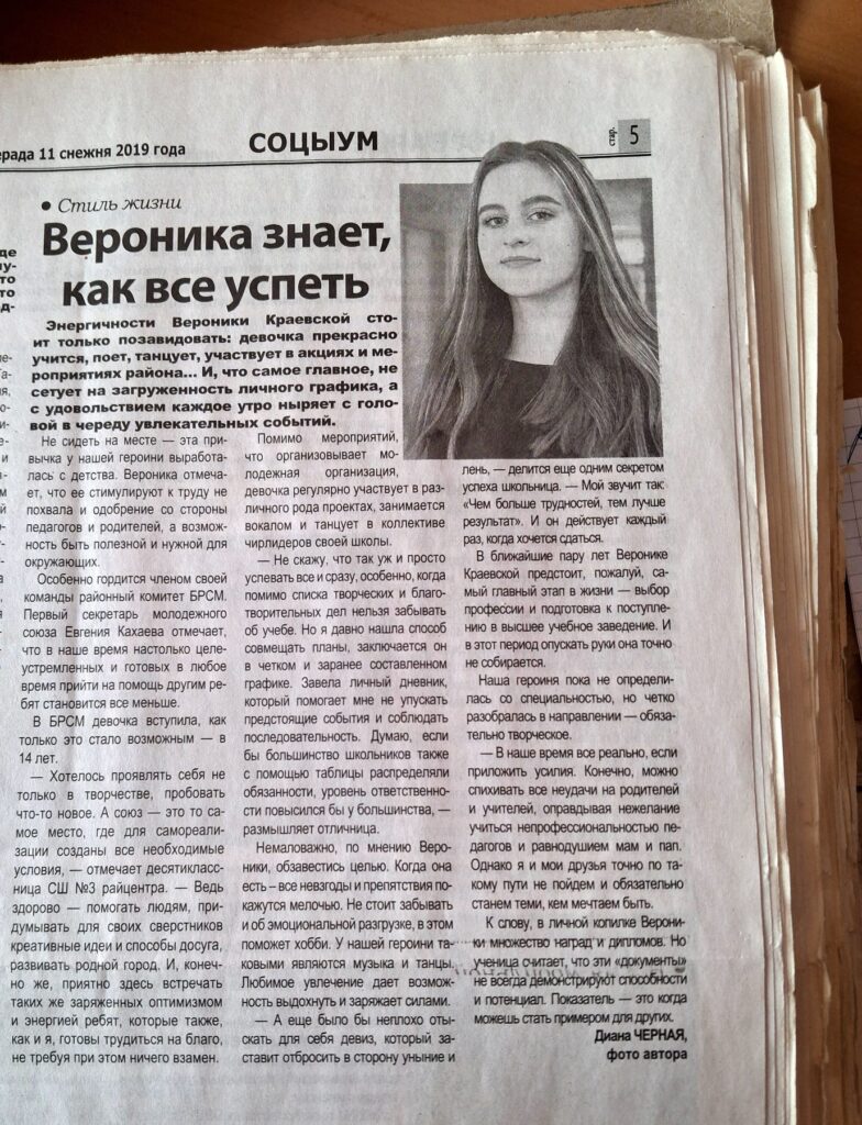 Наш карэспандэнт пазнаёміў чытачоў з няўрымслівай дзясяці-класніцай СШ №3 Веранікай Краеўскай, якая «знает, как все успеть». У артыкуле распавядаецца, што акрамя вучобы шмат часу дзяўчына аддае ўсялякім захапленням. Актывістка маладзёжнага руху ўдзельнічае ў розных праектах, займаецца вакалам, мае дыплом школы мастацтваў па класу акардэона, выступае ў камандзе чарлідараў, валанцёрыць. Такое насычанае жыццё нават патрабавала завесці дзённік з раскладам спраў. Жыткаўчанка прызналася: яе падбадзёрывае ўласны дэвіз «Чым больш цяжкасцяў, тым лепей вынік». І ён дзейнічае ўсялякі раз, калі хочацца здацца.